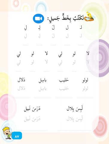 َن ْك ُت ُب ِب َخ ٍّط َجمي ٍل: لـ ل َل لِـ ِل لـ ل َل لِـ ِل لا لو لي لا لو لي لا لو لي لا لو لي لولو َحليب با ِسل َدلال لولو َحليب با ِسل َدلال َد َر َس نَبيل َل ِب َس بِلال َد َر َس نَبيل َل ِب َس بِلال ٨٧