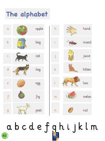 The alphabet a apple h hand b bag i insect c cat j juice d dog k kitten e egg l lion f fig m melon g goat n nut abcdefghijklm 62